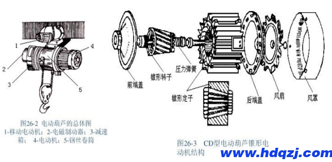 電動(dòng)葫蘆外形如下圖26-2所示。它由提升機(jī)構(gòu)和移動(dòng)裝置兩部分組成,CD型提升機(jī)構(gòu)用錐形電動(dòng)機(jī)拖動(dòng),移動(dòng)裝置用普通籠形電動(dòng)機(jī)拖動(dòng)。錐形電動(dòng)機(jī)與普通電動(dòng)機(jī)的結(jié)構(gòu)不同,CD型電動(dòng)葫蘆的錐形電動(dòng)機(jī)的結(jié)構(gòu)如圖26-3所示。